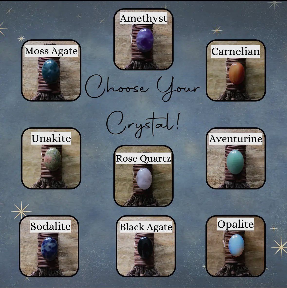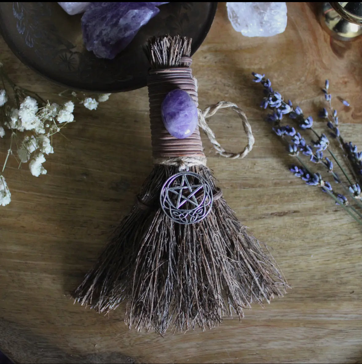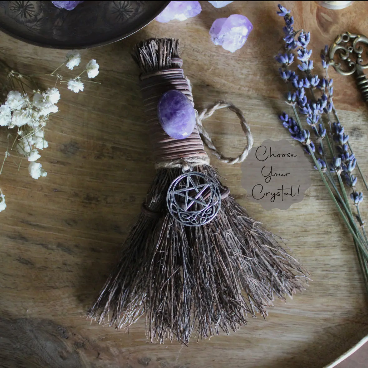 These Celtic pentacle witch brooms are adorned with a silver toned Celtic pentacle charm, and your choice of crystal cabochon! (amethyst, Rose quartz, green adventurine, moss agate, carnelian, black agate, sodalite, unakite and opalite)