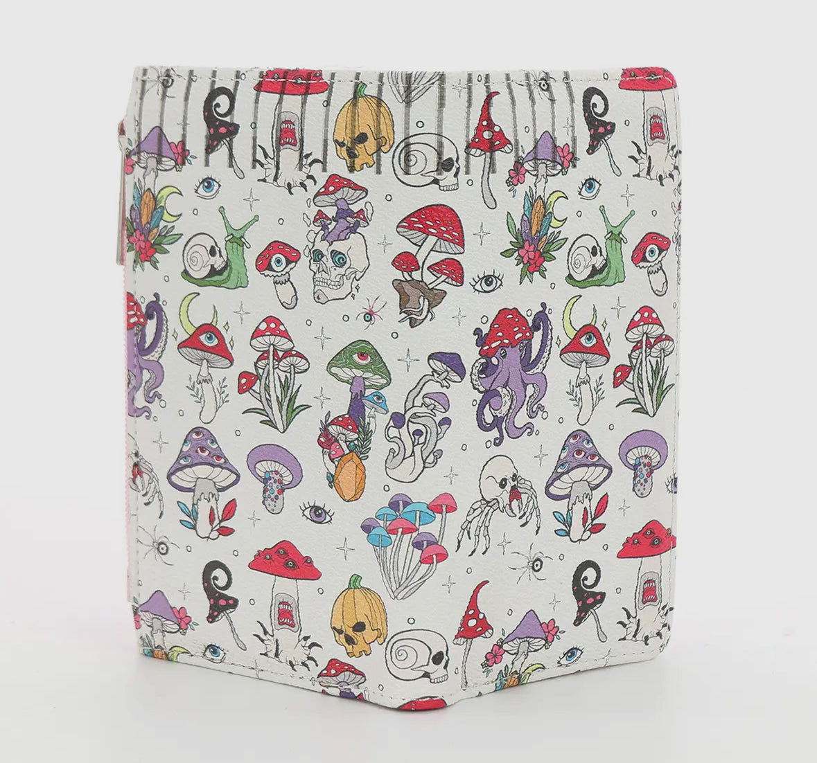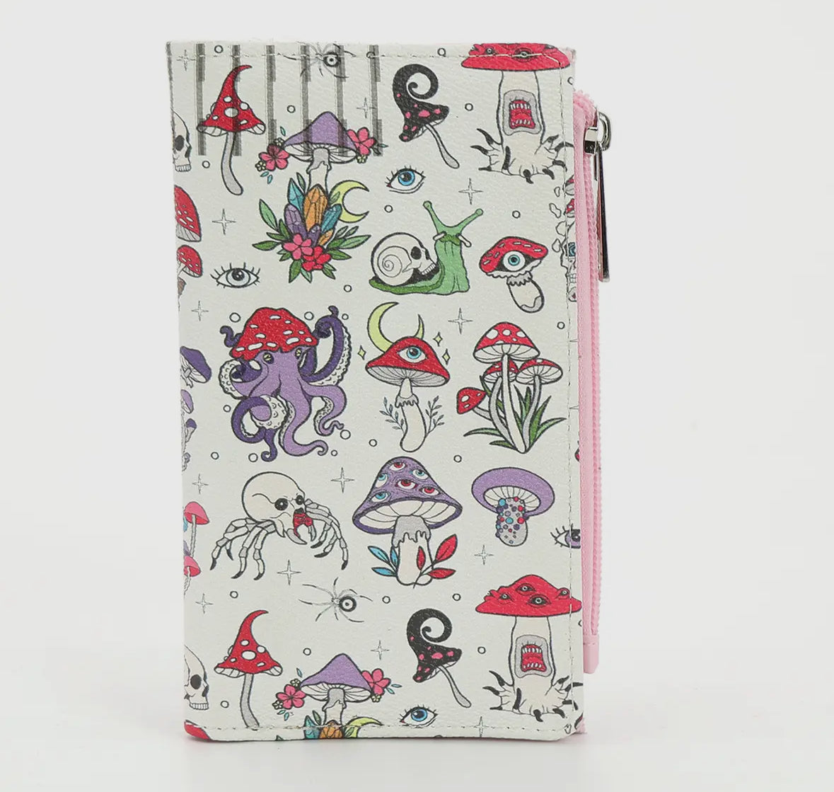 Goth mushrooms wallet! This is essential to the card readers wardrobe! This wallet has a button clasp closure and zippered pocket!
