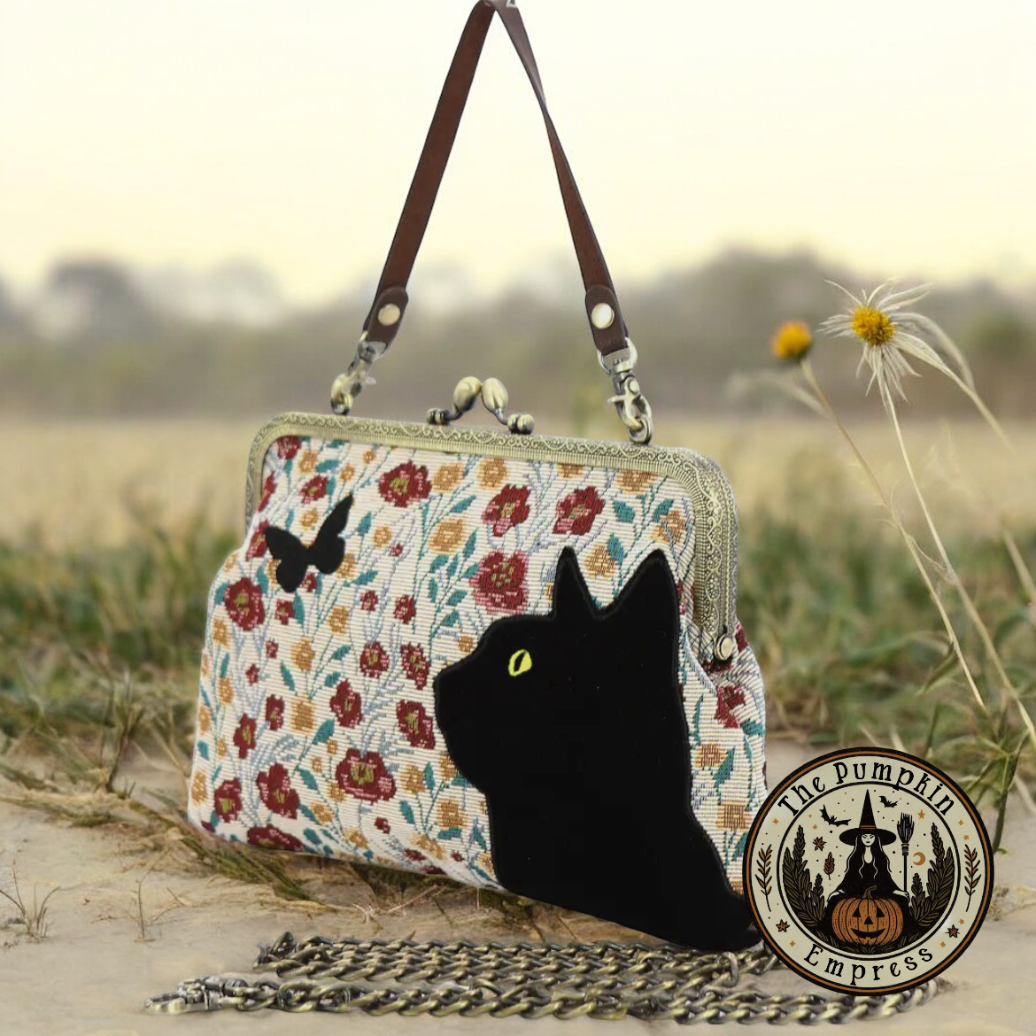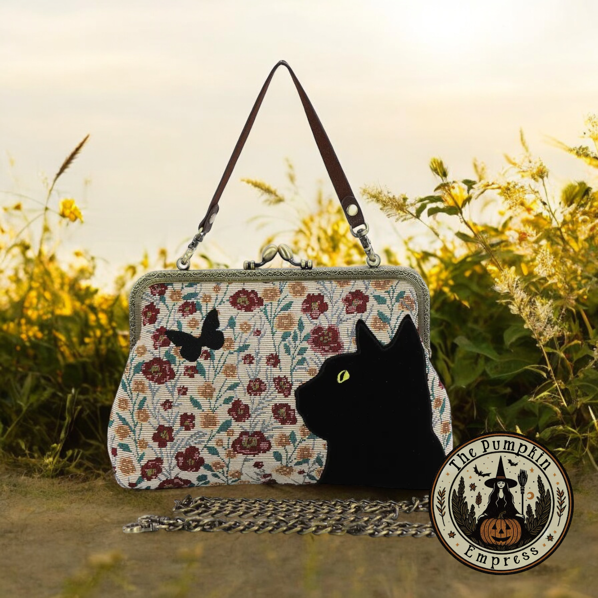 This gorgeous kisslock closure bag has such classic timeless charm, the black cat and butterfly are made with a soft velvet material. It’s is uniquely embroidered with a floral design for that authentic vintage look! It has vintage metal detailing, polka dot fabric lined interior and an interior zipper pocket. Made from a high quality cotton and linen blend of materials.