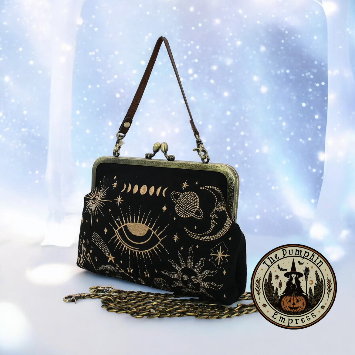 This gorgeous kisslock closure bag has such classic charm, it is uniquely embroidered with a gorgeous celestial design. It has vintage metal detailing, polka dot fabric lined interior and an interior zipper pocket. Made from a high quality cotton and linen blend of materials.