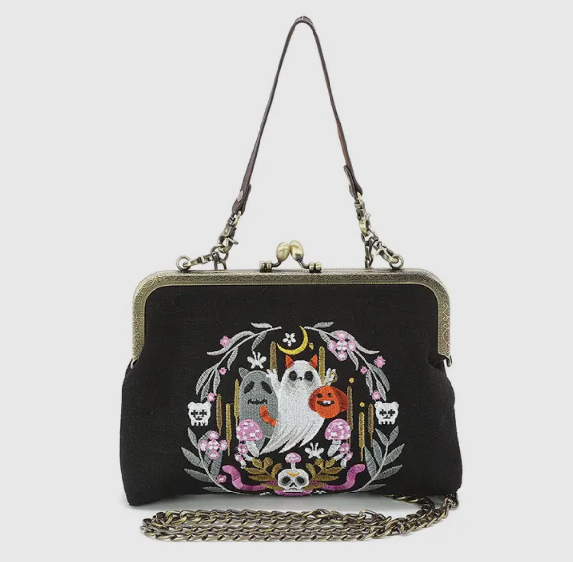 SO CUTE. This gorgeous kisslock closure bag has such classic timeless charm. It’s is uniquely embroidered with a ghosty design for that authentic vintage look! It has vintage metal detailing, polka dot fabric lined interior and an interior zipper pocket. Made from a high quality cotton and linen blend of materials.