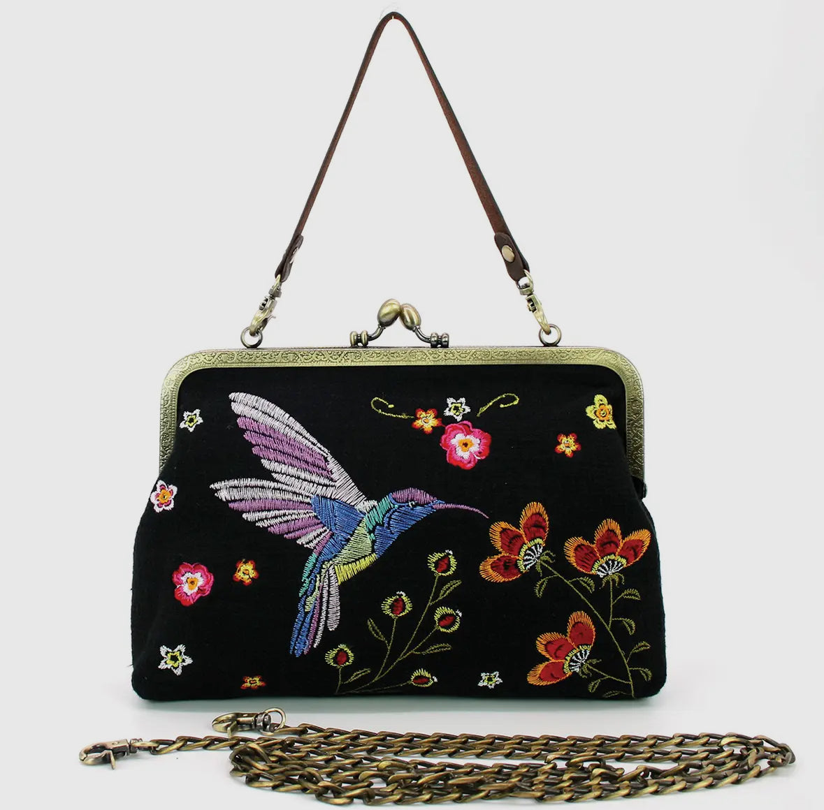 This gorgeous kisslock closure bag has such classic timeless charm. It’s is uniquely embroidered with a hummingbird design for that authentic vintage look! It has vintage metal detailing, polka dot fabric lined interior and an interior zipper pocket. Made from a high quality cotton and linen blend of materials.
