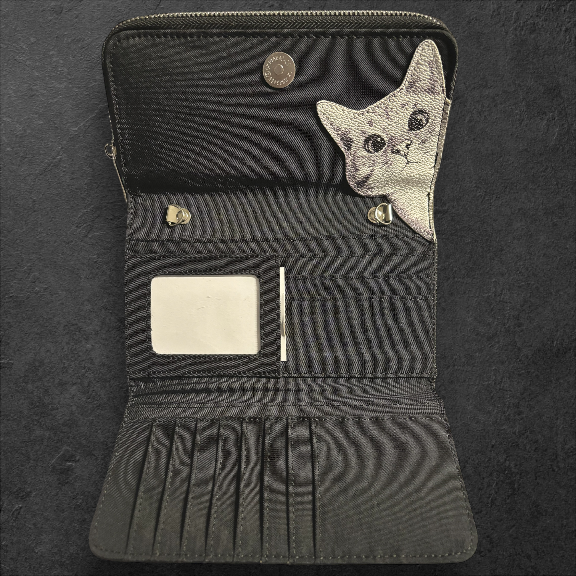 Button clasp closure, zippered exterior pocket, transparent id slot, 10 card slots, bill compartment, interior pockets. This super cute peeking cats wallet comes with a detachable/adjustable shoulder strap!