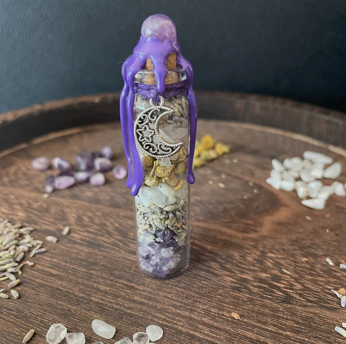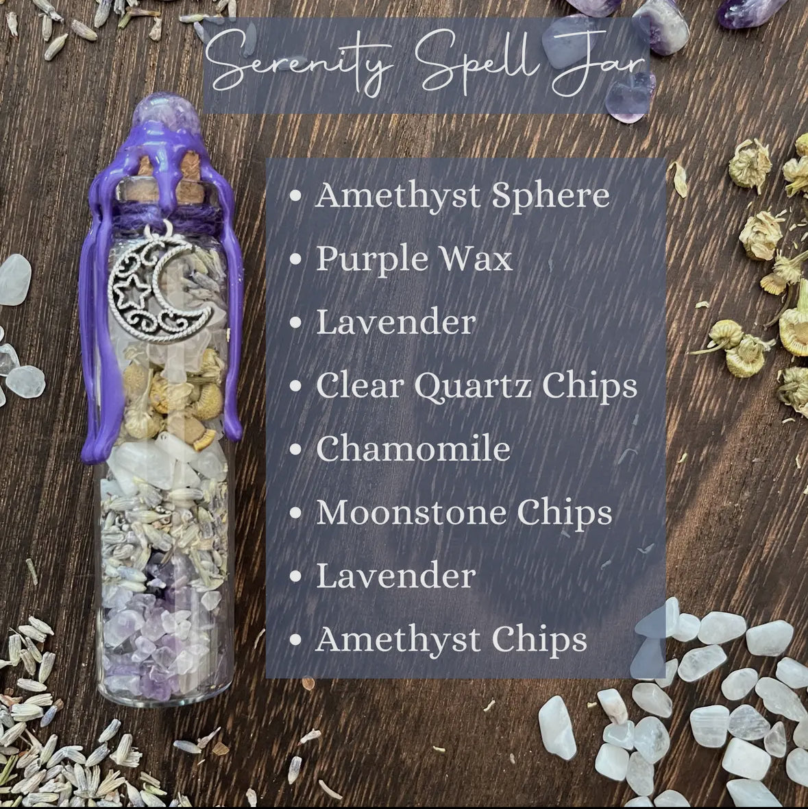 This serenity moon spell jar is filled with lavender, chamomile, amethyst chips, clear quartz chips and moonstone chips. It’s topped with an amethyst mini sphere, a moon charm and sealed with purple wax.